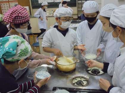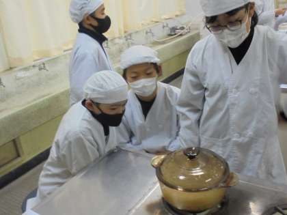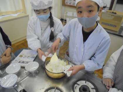 今日は5の3が米を炊いていました。時間を見ながら鍋の中の様子を観察しています。炊きあがった斑から「いいにおい」と声が上がります。持ってきたふりかけでおにぎりを作り,黙食でお米のおいしさを味わっていました。「美味しいからおかわりしていい。」とどんどん食べていますが今日の給食は食べられるかしら。
