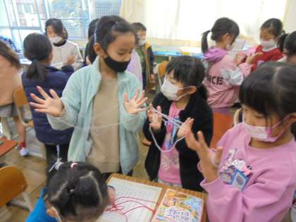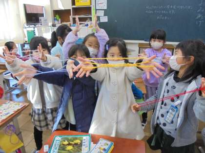 1年生があやとりをしていました。誰に教えてもらったの?と聞くと「ばあばが教えてくれたの。」と作って見せてくれました。そして,お友達が「教えて」と。あやとりの輪が広がります。
