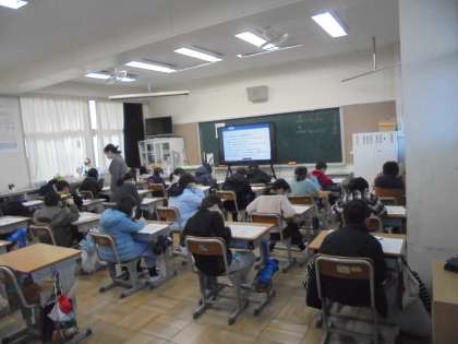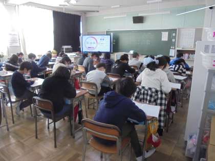 4年生以上が学力診断のためのテストに真剣に取り組んでいました。大型スクリーンには,テストの注意事項やタイマーが提示されていました。