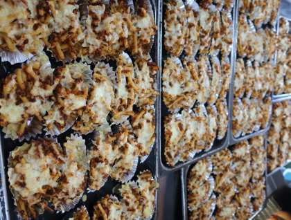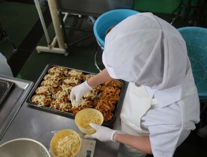 今日のミートグラタンは、給食室で手作りしました。油でにんにくとひき肉、玉ねぎをよく炒め、そこにゆでたマカロニを加え、トマトソースと調味料を加えて具を作ります。作った具をひとつひとつアルミカップにつめて、チーズをのせてオーブンで焼きました。手作りすることは、手間も時間もかかって大変ですが、みなさんの喜ぶ姿を思い浮かべて、心を込めて調理員さんが作ってくださいました。