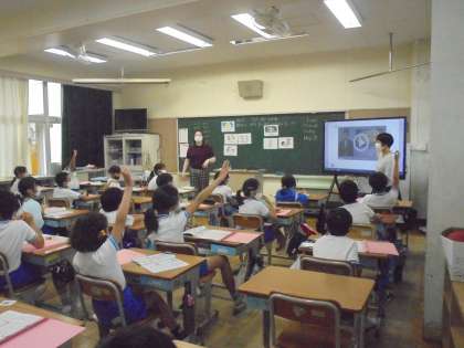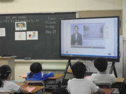 4年生は、モニターに英語で流れているニュースを集中してリスニングしています。