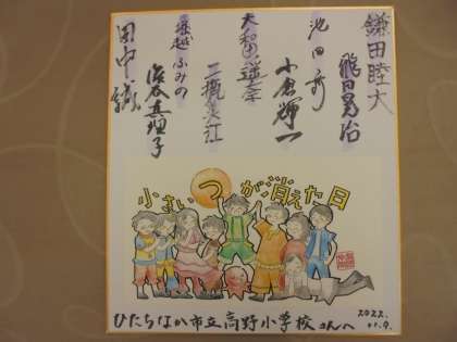 本日、4〜6年生は芸術鑑賞会でした。文化会館で「小さい“っ”が消えた日」という劇を鑑賞しました。鑑賞後、学校に色紙をいただきました。