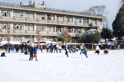 昨日からの降雪で、グランドにも雪が積もりました。中休みには、子どもたちは外に出て、楽しそうに遊んでいました。タイヤの上には、1年生が作った雪だるまが乗っていました。