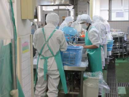 児童の皆さんは雪のため、10時登校ですが、調理員さんは朝から給食の準備で大忙しです。今日は「こふきいも」がでますが、じゃがいもを60キロ使います。じゃがいもを洗って、皮をむき、芽をとって、カットしてゆでて作ります。簡単そうですが、じゃがいもの量がとても多いので大変なメニューです。おいしく食べてくれるといいな。