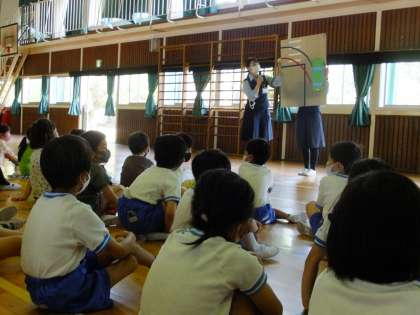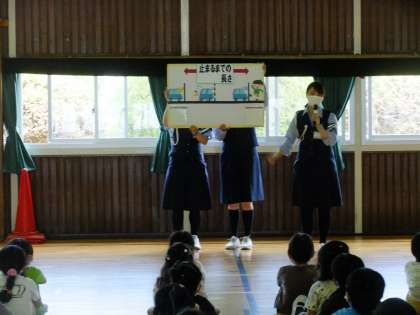 2年生は,車の危険について学習しました。図で車を動かしながら確認すると,改めて危険箇所が見えました。学校生活に慣れた2年生ですが,危険を知って安全に生活してほしいです。今日は,交通安全母の会の皆様に司会進行,写真撮影。そして,ひたちなか市役所内防災交通課交通安全係の皆様にご指導いただきました。ご協力ありがとうございました。