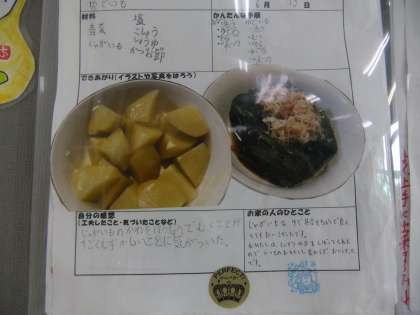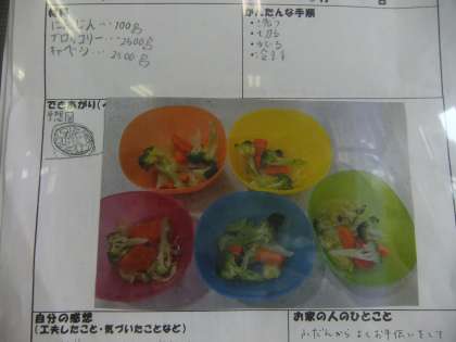 学校で調理実習は実施していない状況です。5年生は,家庭科の「ゆで野菜」をご家庭で実施してきたものを掲示していました。みんなおいしそうなものができています。