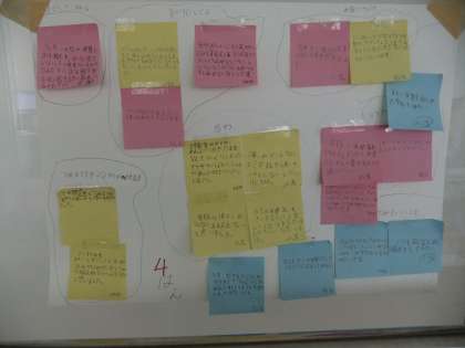 4年生は,ICTサポーターの先生と一緒にタブレットでプレゼンテーション作成の学習をしていました。廊下には,「ゴミ」について話し合った跡が見える付箋の掲示物があります。全てがタブレットではなく,ICTと紙媒体など効果的な使い方を考えていきます。