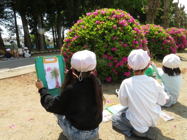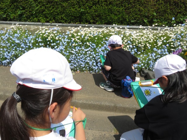 2年生が校庭で図画工作のスケッチをしていました。