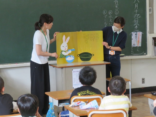 今朝は、2年生の教室で、すぎのこおはなし会の皆さんによる読み聞かせです。