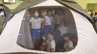 7/3(木)~4(金)に実施した5年生の宿泊学習の様子を、何回かに分けてお伝えしたいと思います。最初は、1日目午前中のテント張り体験と昼食の様子です。