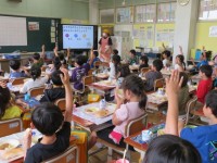 1年生が給食の時間に栄養指導を受けました。食事をしながら給食に関する話を聞き、給...