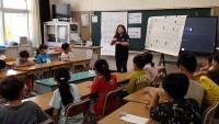 4年生の教室では、タブレットに「たこやき」「ふじさん」「おまつり」「おんがく」な...