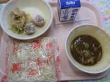 今日の給食は、カレーうどん、牛乳、しゅうまい、中華サラダです。年に2回のめんの...