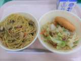 今日の給食はジェノベーゼスパゲティ 牛乳 コロッケ オニオンドレッシングサラダで...