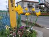 写真のように、正門前の小さな花壇に黄色い花が、正門を入ると右側の花壇に白い花が咲...