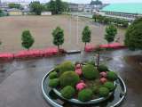 校舎前の舗装の部分とグラウンドの境にサツキの植込みがあります。 今、そのサツキが...