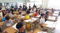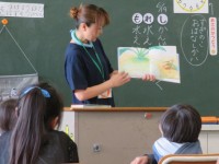 1年生が給食の時間に栄養指導を受けました。食事をしながら給食に関する話を聞き、給...