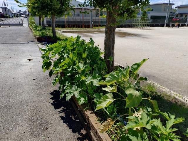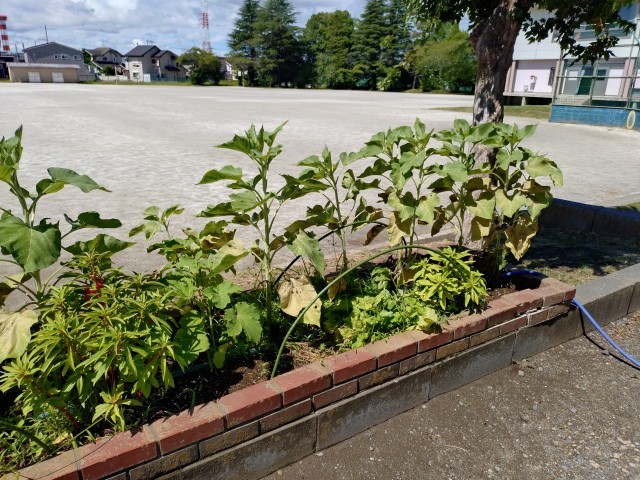 8/5(火)3年生の学年花壇に植えたひまわり、ホウセンカ、オクラなどが大きく成長しています。