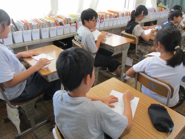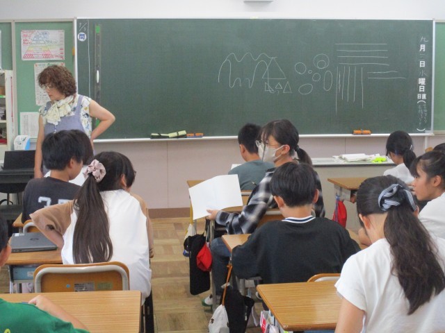 9月3日(水) 5年生が図工の学習で、画家の矢島先生をお迎えして絵画の学習をスタートしました。5年生の絵画は、「○○している私」というテーマで作品づくりを進めています。1回目の絵画学習では、構図のとり方について矢島先生に説明していただいた後、鉛筆の持ち方や描き方を教えていただきました。ノートを書くときの鉛筆の持ち方とは違う持ち方だったので、丸や三角や四角、波線などいろいろな線を描き練習しました。最後に簡単に各自が描こうとしている構図をラフスケッチしてみました。矢島先生から早速アドバイスをしてもらいながら、真剣に取り組むことができました。次回も下書きを矢島先生にご指導いただく予定です。