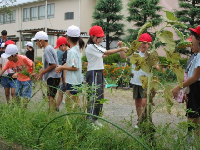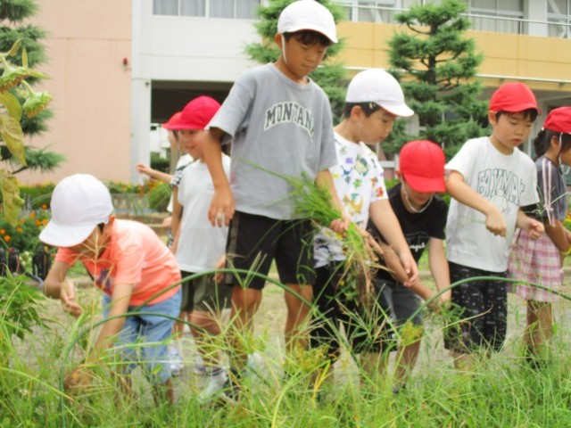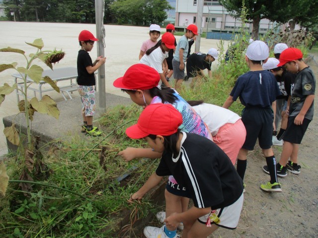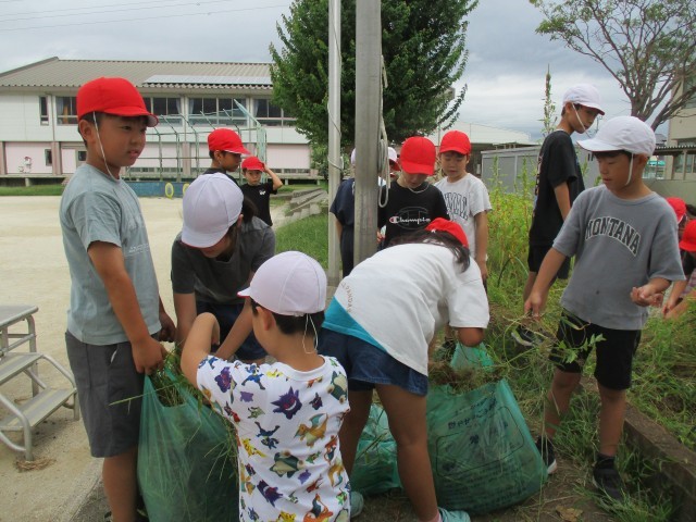 9月4日(木) 夏休み中伸びてしまった花壇の草を3年生が一生懸命除草作業しました。花壇に植えてあるヒマワリやオクラを取らないように、「これはとっていい草かな。」と確認しながら、背が高くなった草をみんなで草むしり。草引きをする児童、とった草を運ぶ児童、袋に草をまとめている児童とみんなで協力して進めることができました。終わった後の花壇は、とてもすっきりした状態になりました。