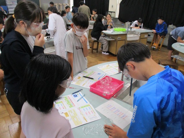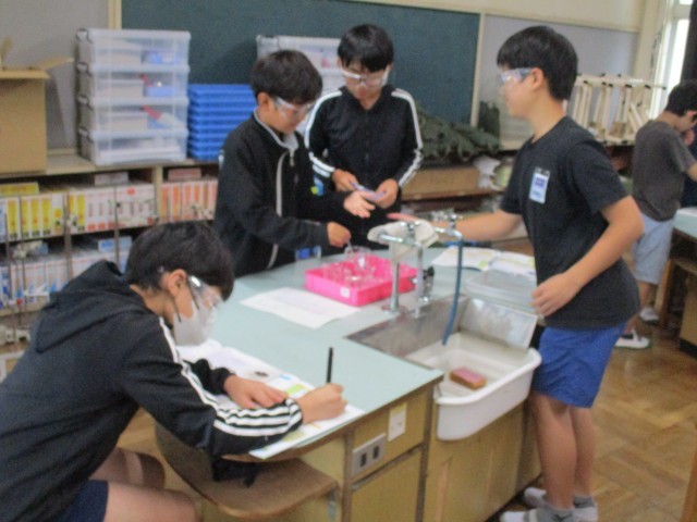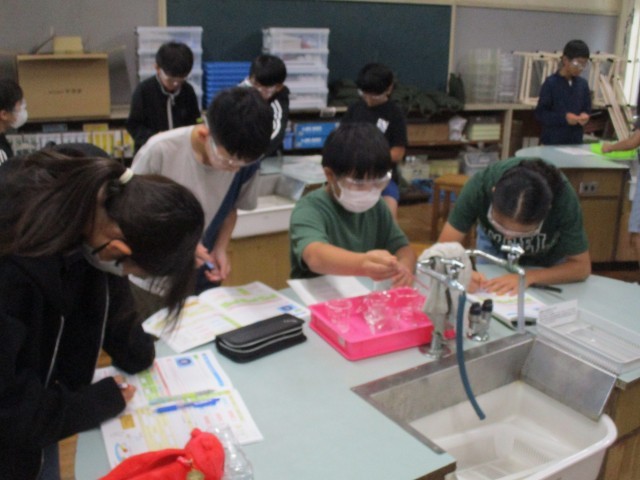 10月6日(月) 6年生が、サイエンスサポーターの藤田先生と一緒に水溶液の実験に取り組みました。今回は5つの水溶液の性質をリトマス紙を使って調べる実験に取り組みました。グループ内で分担して友達と協力して実験しました。「青色リトマス紙が赤色に変わったから酸性だね。」「中性だと思っていたのにアルカリ性なんだ。」と色が変わる様子を熱心に観察していました。
