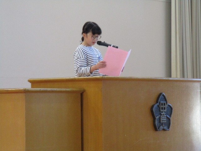 10月10日(金) 前期終業式を体育館で実施しました。2年生の代表児童は「教室がきれいだと気持ちがよいので掃除をがんばった」、4年生の代表児童は「分かりやすい文章を書くことを目標に努力した」と発表しました。2人とも堂々とした姿勢で、話すことができていました。校長先生から前期を振り返って田彦小の児童の頑張りのお話をいただきました。最後に、校歌を元気いっぱいに歌うことができました。後期に向けて、さらに頑張っていってほしいと思います。