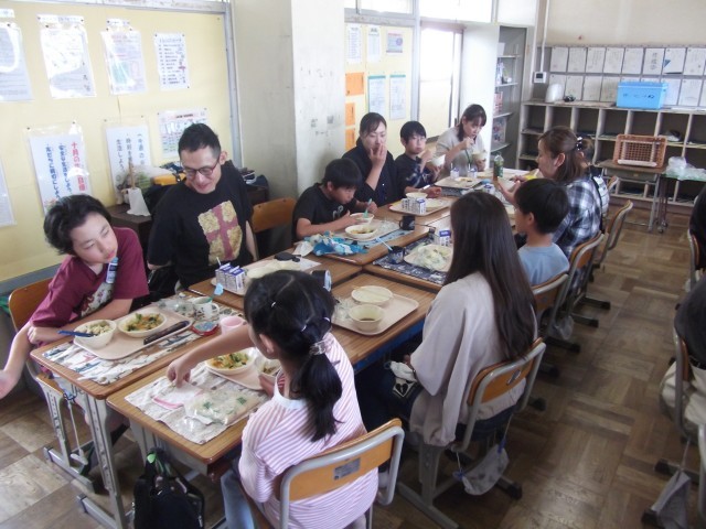 親子給食では、「給食おいしいね」「牛乳パックはこう畳むんだよ」などの会話があちこちで聞こえ、温かい雰囲気に包まれていました。