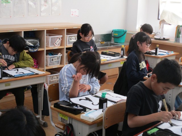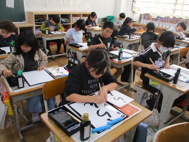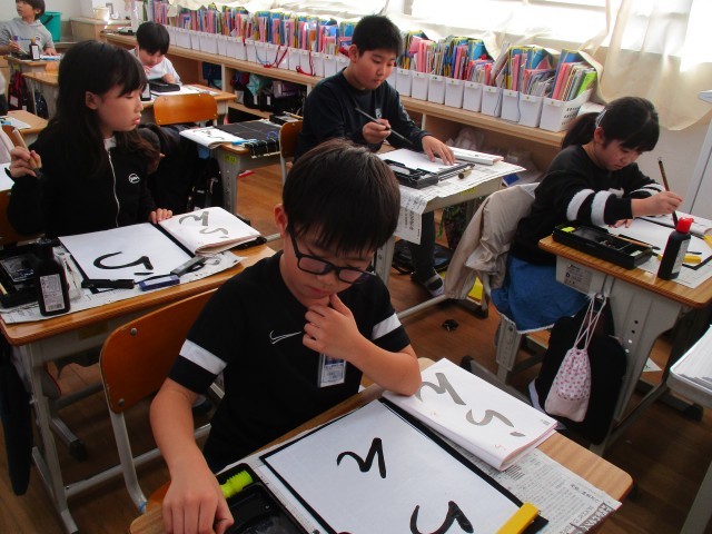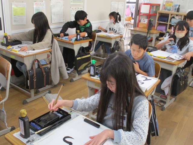 11月6日(木) 4年生が毛筆の学習で「らん」という課題に取り組みました。この学習では「平がなの折れ」の筆の動かし方を学びます。「らの曲がっているところが難しい。」「んの折れの所が苦手だな。」とそれぞれの文字の特徴を捉え、筆の進め方を考えながら取り組んでいました。