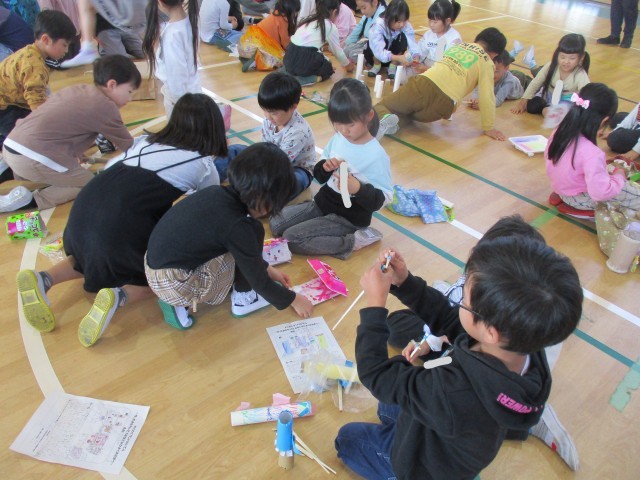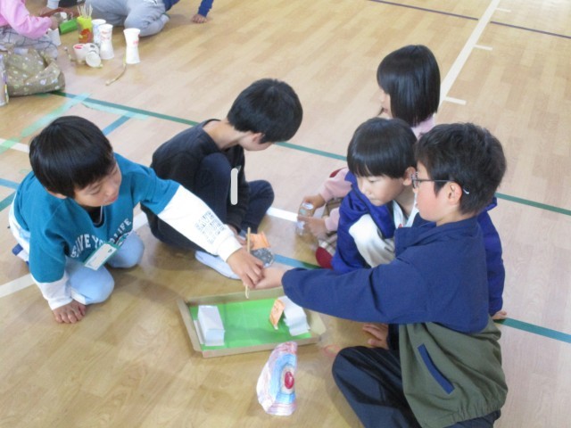 11月7日(金) 2年生が、生活科の授業で作成したおもちゃを使って、1年生と遊びました。それぞれのグループに分かれて1年生に優しく遊び方を教えていたのでとても賑やかに交流することができました。