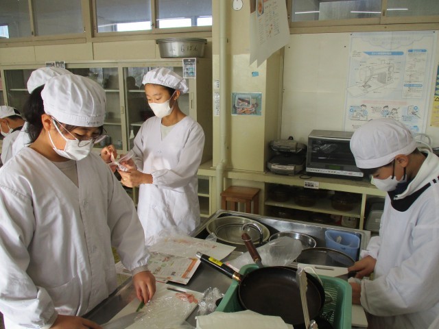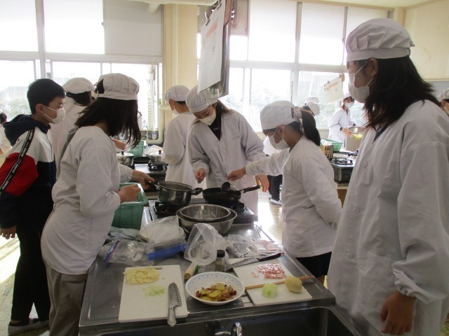 11月11日(火) 6年生が家庭科の学習で調理実習を行いました。「厚揚げと野菜のチャンプルー」「野菜のベーコン巻き」「ベーコンポテト」の中から各自が作りたいものを選択し材料を準備しました。野菜を洗って切ったり、炒めたりする中で、手際よく調理を進める児童がいました。苦手な児童は、友達にアドバイスをもらいながら取り組んでいる児童もいましたが、自分が作った食事はとても美味しくできました。今日の経験をいかして、自宅でも家族に料理の腕を披露できるといいですね。