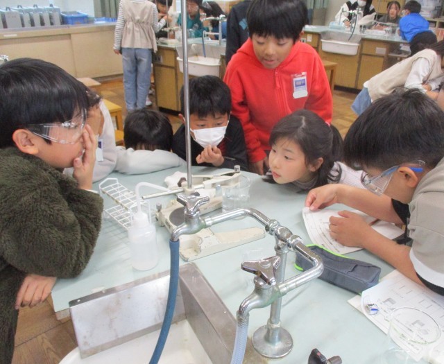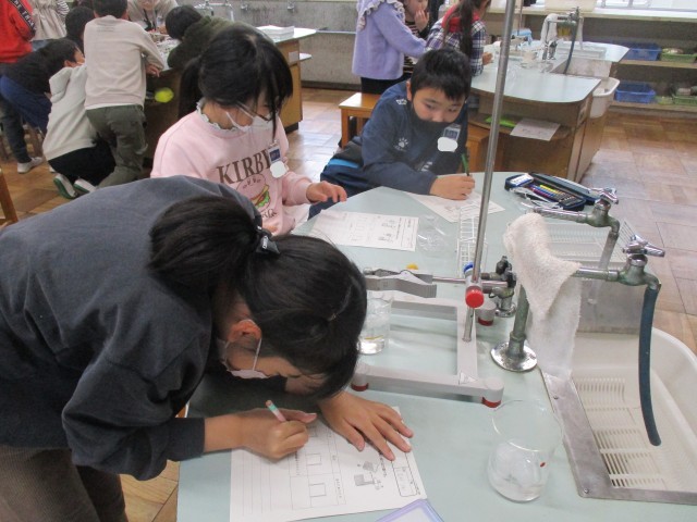 12月8日(月) 4年生が理科の実験に取り組みました。「ものの温度と体積」の学習の中で、水を温めたり冷やしたりするとき体積はどのように変化するかを確かめる実験を行いました。水が入った試験管をお湯で温めると「水面があがったよ。」「水面が盛り上がったよ。」と変化に驚く児童がいました。同様に水が入った試験管を氷水で冷やすと「水面が下がった。」と実験記録を記録する児童がいました。グループの友達と協力して活動する姿が多く見られました。