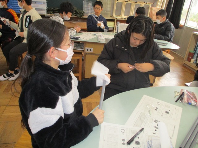 また、静電気の実験では、塩化ビニルパイプをこすって電気をため、アルミホイルで作ったクリスマスツリーが引き寄せられる様子を観察しました。目に見えない力が働く様子を間近で見ることで、興味をもって実験に取り組む姿が見られました。