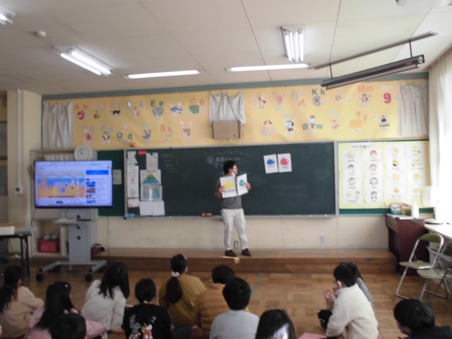 1/9(金)今年はじめの外国語の授業がありました。AETの先生とともに、十二支がでてくるすごろくゲームやI like ~.ですきな動物を言ったり動物の食べる野菜を英語で言う活動や色カルタなどの活動を楽しく行いました。元気に楽しく外国語活動する様子が今年もみられています。