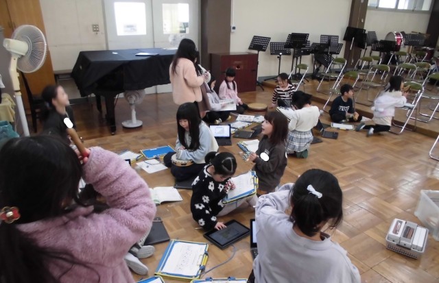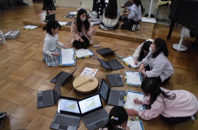 1月19日(月) 5時間目に音楽の授業を行いました。7~8人のグループに分かれ、「かぼちゃ」という曲に合う楽器の演奏の仕方について、実際に楽器を使って考えました。