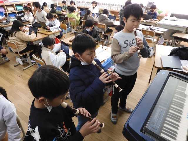 1/28(水)リコーダーでパフの演奏を行いました。重なり合う音の響きを感じ取りながら演奏することができました。