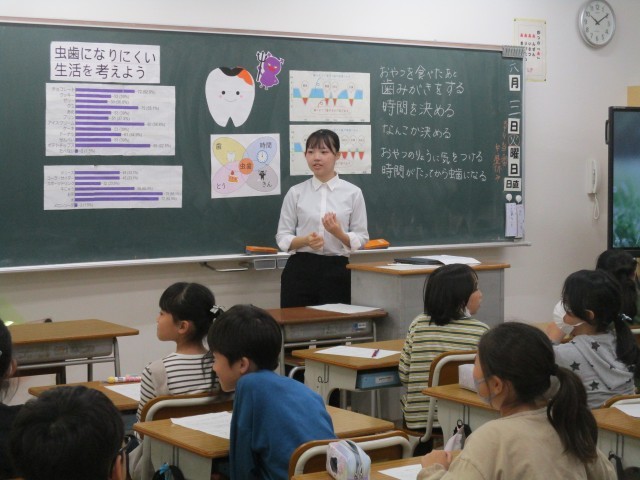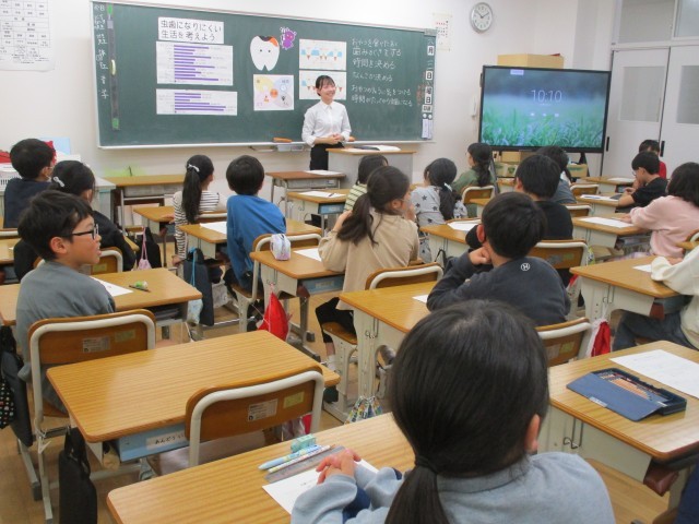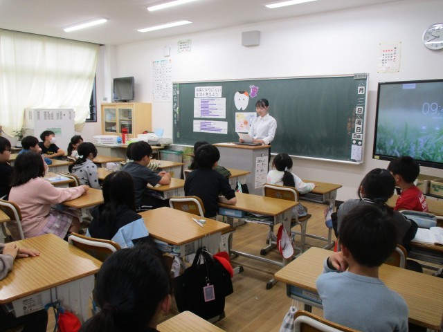 6月3日(火) 5月19日から養護実習できている先生と4年生が「虫歯にならない生活」について学習しました。4年生は、虫歯になる仕組みを知り、これからの生活でどのようなことに気を付けておやつを食べていくべきか考えました。「時間を決めて食べる。」「何個か数を決めて食べる。」「おやつの量に気を付ける。」などの意見が出ました。学習したことをこれからの生活に活かしていきたいです。