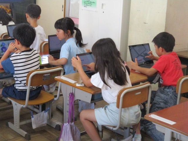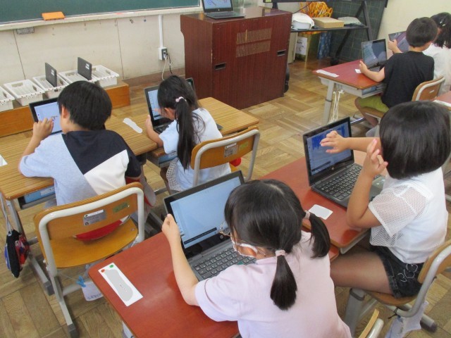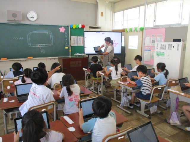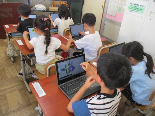 6月18日(水) 1年生が初めて、タブレットの学習に取り組みました。タブレットのログインの仕方や扱い方を学んだ後、お絵かきソフトを使って絵を描きました。キャラクターや風景などを描いたり、お互いに絵を見せ合ったり、初めてのタブレットを使っての学習でしたが、子供たちは戸惑うことなく意欲的に活動することができました。