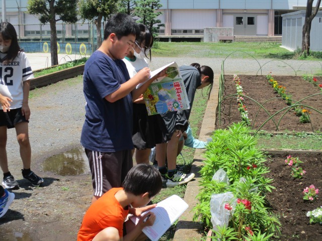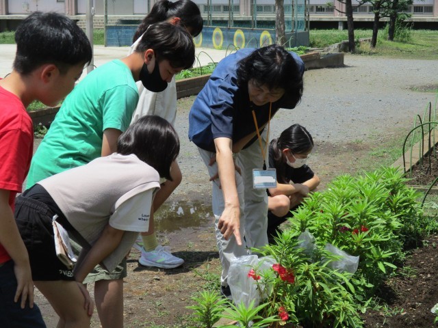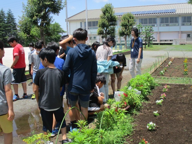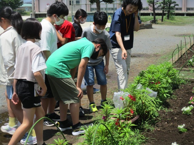 6月27日(金) 6年生が梅雨の晴れ間を利用して、植物の蒸散の学習をしました。朝のうちにビニール袋をかけておいた葉があるホウセンカと葉を取り除いたホウセンカの袋の様子を観察しました。両方とも袋の内側に水滴がついている様子を見て、「葉を取っていないホウセンカの方が水滴がたくさんついているね。」「葉がついている方が水滴があるということは、葉から水蒸気が出ていることが分かるね。」「葉がないホウセンカも少しは、水蒸気が出ているんだね。」と2つを比較しながら、分かったことを記録することができました。