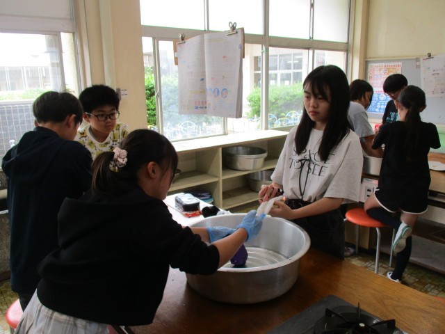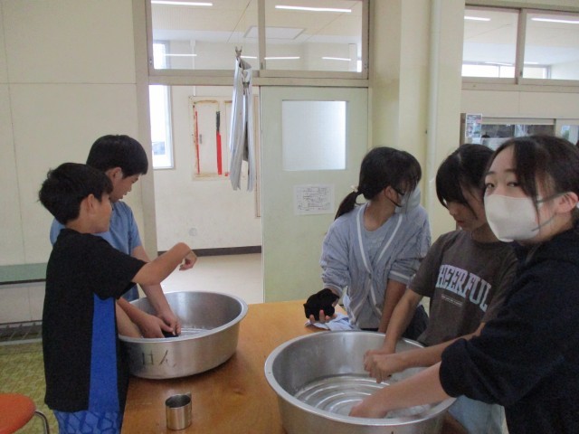 6年生 洗濯実習 公開日 2025/07/11 更新日 2025/07/11 6年生 7月11日(金) 6年生が家庭科の洗濯の学習をしました。生活の中で手洗いの経験が少ない子供たちにとって、たらいと粉洗剤を使って手洗いをすることは新鮮なことでした。適切な洗剤量を使って、自分の靴下を一生懸命手洗いしました。手洗い後きれいになった靴下を干し、持ち帰ることができました。家庭でも、学習をいかして、自分の洗濯物を手洗いする児童が増えるかもしれませんね。 +1