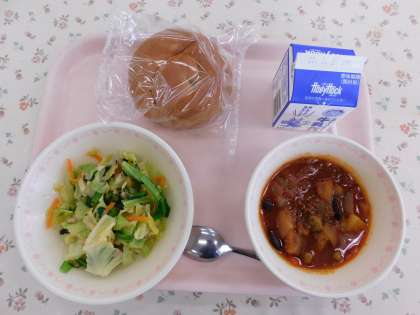 【こんだて】 黒パン 牛乳 チリビーンズ オニオンドレッシングサラダ