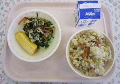 【こんだて】 いばらきのめぐみごはん ぎゅうにゅう あつやきたまご さくらだこタコのいそあえ
