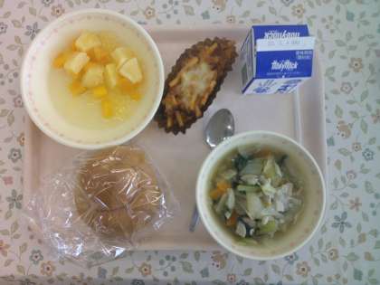 【こんだて】 くろパン ぎゅうにゅう ミートグラタン むぎいりやさいスープ フルーツポンチ