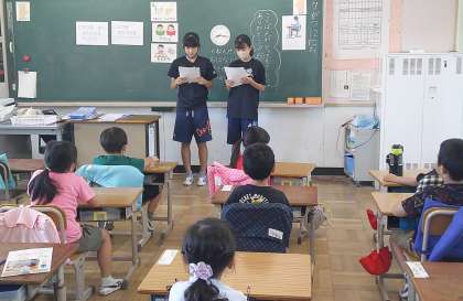 国語科の発展学習として、学校のきまりを1年生に教えに行きました。