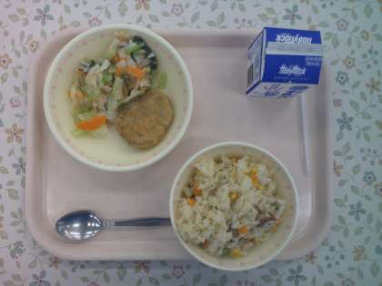 【こんだて】 コーンピラフ ぎゅうにゅう カレーメンチカツ レモンドレッシングサラダ