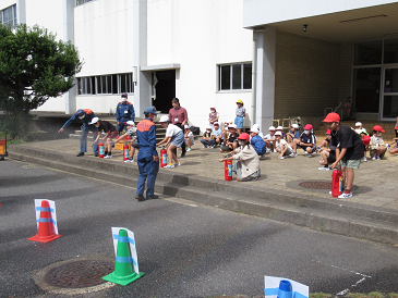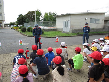 消防署の職員の方にお越しいただき、消火器を使う練習をさせていただいたり、災害が起きた時のことについてお話をしていただいたりしました。