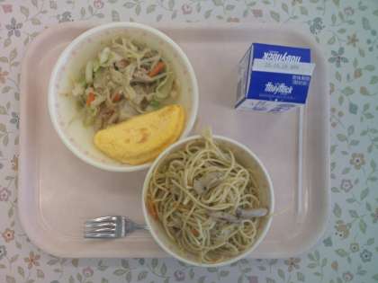 【こんだて】 ジェノベーゼスパゲッティ ぎゅうにゅう オムレツ オニオンドレッシングサラダ