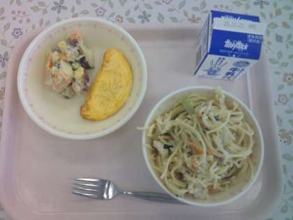 【こんだて】 こめこのクリームスパゲッティ ぎゅうにゅう トマトいりオムレツ さつまいもサラダ