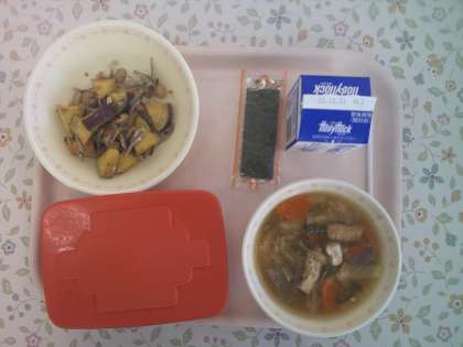【こんだて】 ごはん ぎゅうにゅう だいずとさつまいものあまからあげ みぞれじる あじつけのり