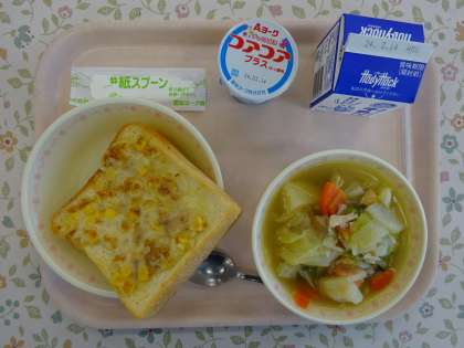 【こんだて】 コーンマヨネーズトースト ぎゅうにゅう やさいのスープに ヨーグルト
