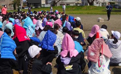 学校での火事や地震などの災害が起こったときに、教室からどのように避難するのかを確認しました。防災頭巾をかぶって、避難経路を通って校庭に避難する訓練をしました。訓練後は、自分の命を守るための約束「お(おさない)・か(廊下や階段でかけない)・し(しゃべらない)・も(もどらない)」を振り返りました。